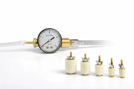 Manômetro especial acompanha a pressão aplicada durante o teste, garantindo diagnóstico seguro.