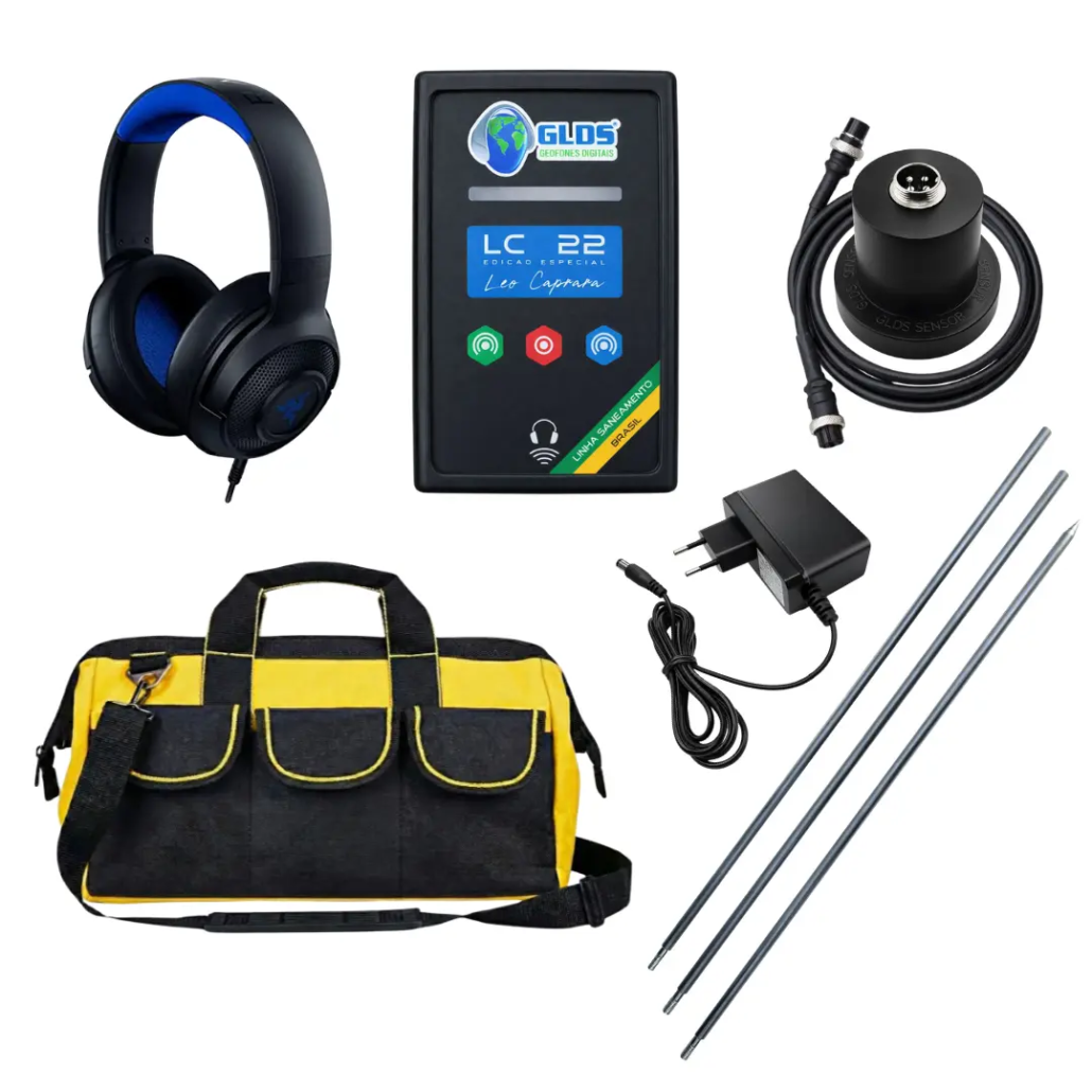 O LC 22 é fornecido como KIT COMPLETO, incluindo CPU e sensor com capas protetoras emborrachadas, haste de escuta com prolongadores, fones de ouvido e bolsa de transporte em lona com alça, facilitando o deslocamento, a proteção dos componentes e o uso diário por equipes de saneamento.